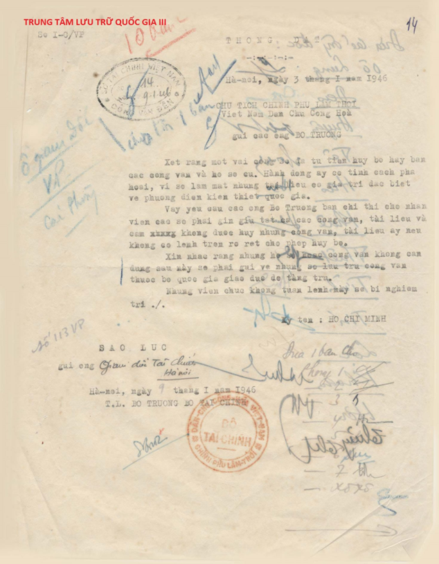 Sau khi giành chính quyền, một hiện tượng phổ biến xảy ra ở các công sở là hồ sơ, tài liệu của chế độ cũ để lại đã bị tùy tiện tiêu hủy hoặc đem bán. Vì vậy, ngày 3/1/1946, Chủ tịch Hồ Chí Minh đã ký Thông đạt số 1-C/VP gửi các ông bộ trưởng của Chính phủ lâm thời.